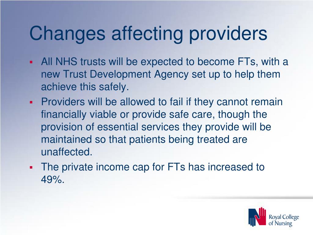 Changes affecting providers • All NHS trusts will be expected to become FTs, with a new Trust Development Agency set up to help them achieve this safely. • Providers will be allowed to fail if they cannot remain financially viable or provide safe care, though the provision of essential services they provide will be maintained so that patients being treated are unaffected. • The private income cap for FTs has increased to 49%.