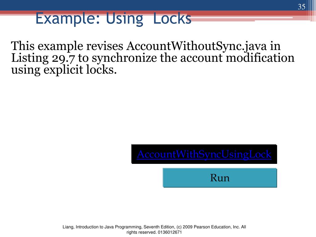 Example: Using Locks This example revises AccountWithoutSync.java in Listing 29.7 to synchronize the account modification using explicit locks. AccountWithSyncUsingLock Run