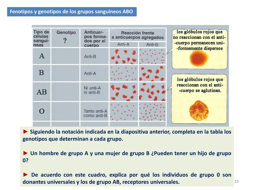 Fenotipos y genotipos de los grupos sanguíneos ABO ► Siguiendo la notación indicada en la diapositiva anterior, completa en la tabla los genotipos que determinan a cada grupo. ► Un hombre de grupo A y una mujer de grupo B ¿Pueden tener un hijo de grupo 0? ► De acuerdo con este cuadro, explica por qué los individuos de grupo 0 son donantes universales y los de grupo AB, receptores universales.