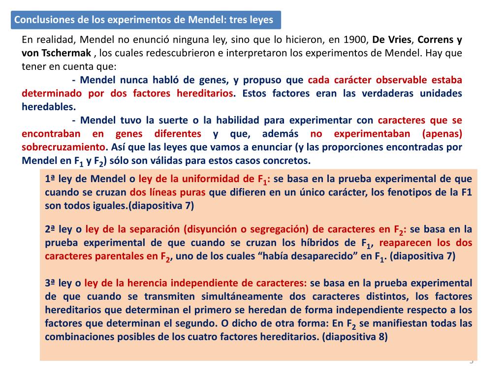 En realidad, Mendel no enunció ninguna ley, sino que lo hicieron, en 1900, De Vries, Correns y von Tschermak , los cuales redescubrieron e interpretaron los experimentos de Mendel. Hay que tener en cuenta que: - Mendel nunca habló de genes, y propuso que cada carácter observable estaba determinado por dos factores hereditarios. Estos factores eran las verdaderas unidades heredables. - Mendel tuvo la suerte o la habilidad para experimentar con caracteres que se encontraban en genes diferentes y que, además no experimentaban (apenas) sobrecruzamiento. Así que las leyes que vamos a enunciar (y las proporciones encontradas por Mendel en F1 y F2) sólo son válidas para estos casos concretos. • Conclusiones de los experimentos de Mendel: tres leyes 1ª ley de Mendel o ley de la uniformidad de F1: se basa en la prueba experimental de que cuando se cruzan dos líneas puras que difieren en un único carácter, los fenotipos de la F1 son todos iguales.(diapositiva 7) 2ª ley o ley de la separación (disyunción o segregación) de caracteres en F2: se basa en la prueba experimental de que cuando se cruzan los híbridos de F1, reaparecen los dos caracteres parentales en F2, uno de los cuales “había desaparecido” en F1. (diapositiva 7) 3ª ley o ley de la herencia independiente de caracteres: se basa en la prueba experimental de que cuando se transmiten simultáneamente dos caracteres distintos, los factores hereditarios que determinan el primero se heredan de forma independiente respecto a los factores que determinan el segundo. O dicho de otra forma: En F2 se manifiestan todas las combinaciones posibles de los cuatro factores hereditarios. (diapositiva 8)