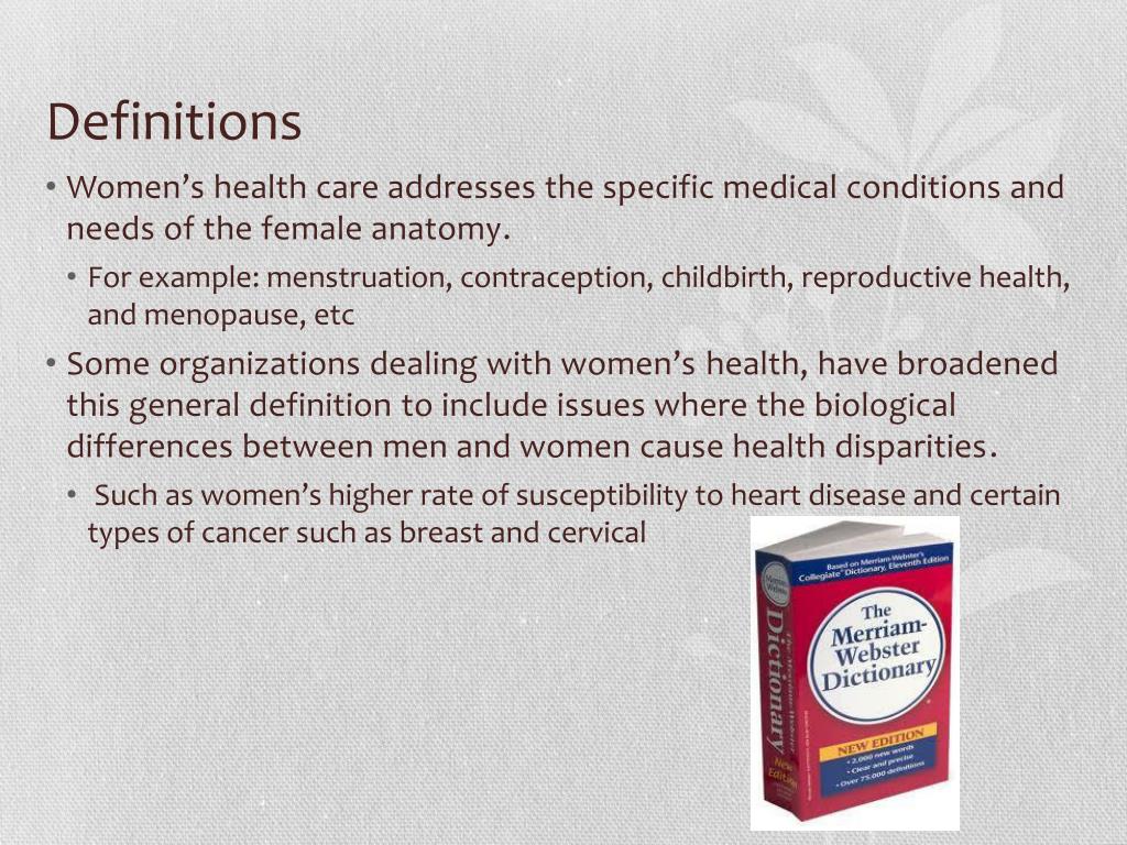 Definitions • Women’s health care addresses the specific medical conditions and needs of the female anatomy. • For example: menstruation, contraception, childbirth, reproductive health, and menopause, etc • Some organizations dealing with women’s health, have broadened this general definition to include issues where the biological differences between men and women cause health disparities. • Such as women’s higher rate of susceptibility to heart disease and certain types of cancer such as breast and cervical