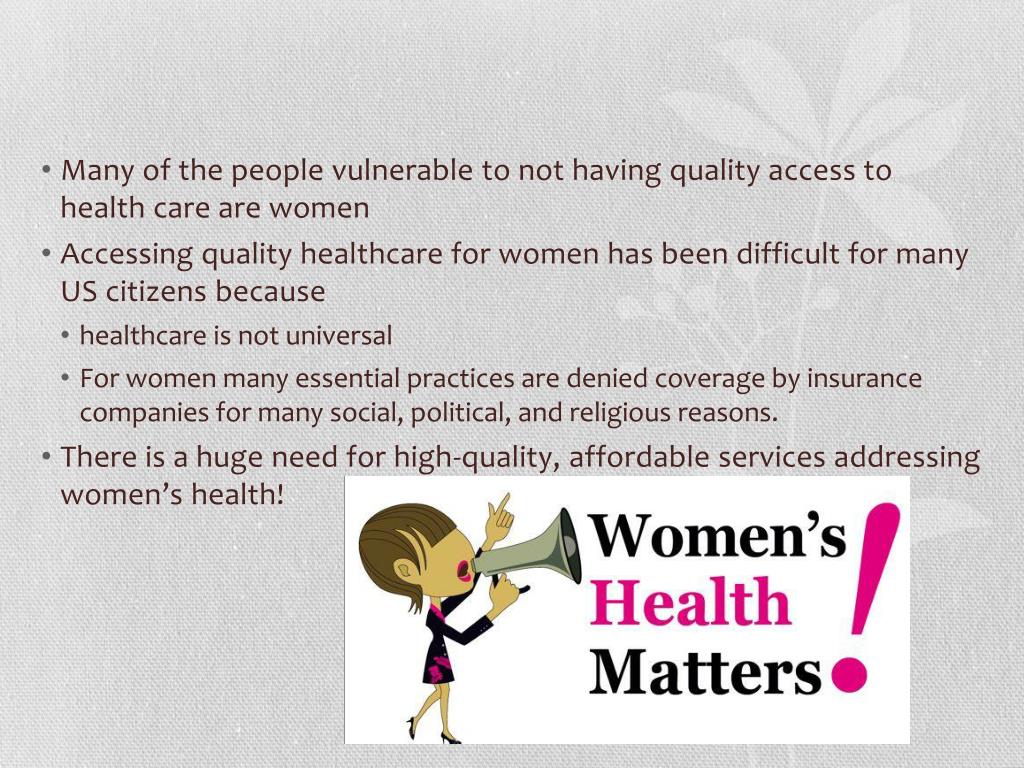 Many of the people vulnerable to not having quality access to health care are women • Accessing quality healthcare for women has been difficult for many US citizens because • healthcare is not universal • For women many essential practices are denied coverage by insurance companies for many social, political, and religious reasons. • There is a huge need for high-quality, affordable services addressing women’s health!