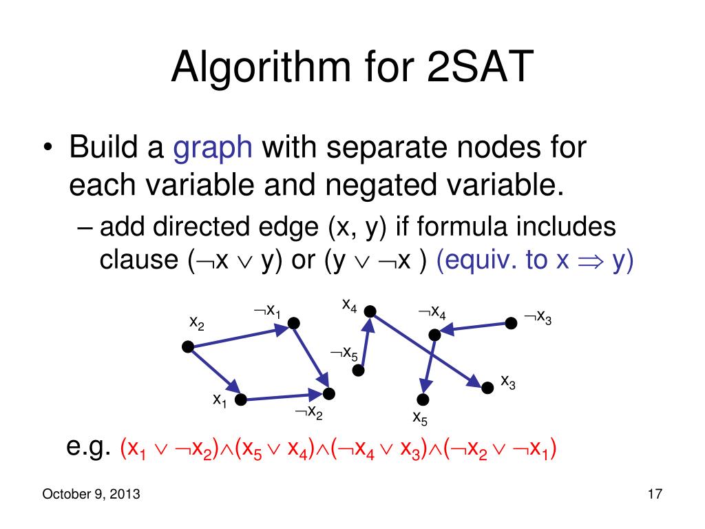 Algorithm for 2SAT • Build a graph with separate nodes for each variable and negated variable. • add directed edge (x, y) if formula includes clause (x y) or (y x ) (equiv. to x y) x4 x1 x4 x3 x2 x5 x3 x1 x2 x5 e.g. (x1 x2)(x5 x4)(x4 x3)(x2 x1)