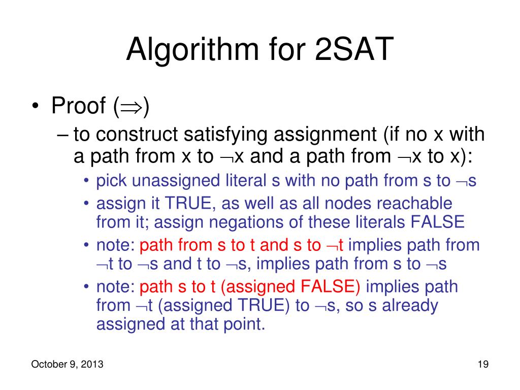 Algorithm for 2SAT • Proof () • to construct satisfying assignment (if no x with a path from x to x and a path from x to x): • pick unassigned literal s with no path from s to s • assign it TRUE, as well as all nodes reachable from it; assign negations of these literals FALSE • note: path from s to t and s to t implies path from t to s and t to s, implies path from s to s • note: path s to t (assigned FALSE) implies path from t (assigned TRUE) to s, so s already assigned at that point.