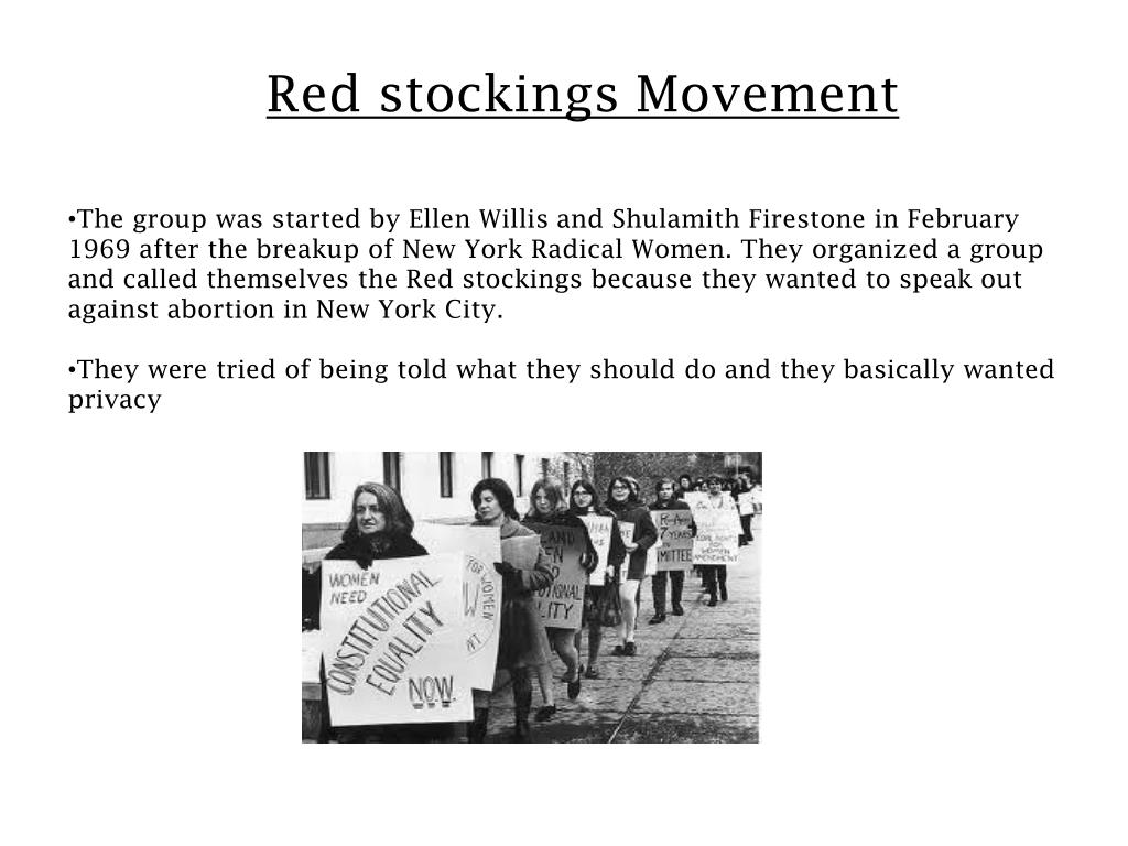 Red stockings Movement • The group was started by Ellen Willis and Shulamith Firestone in February 1969 after the breakup of New York Radical Women. They organized a group and called themselves the Red stockings because they wanted to speak out against abortion in New York City. • They were tried of being told what they should do and they basically wanted privacy