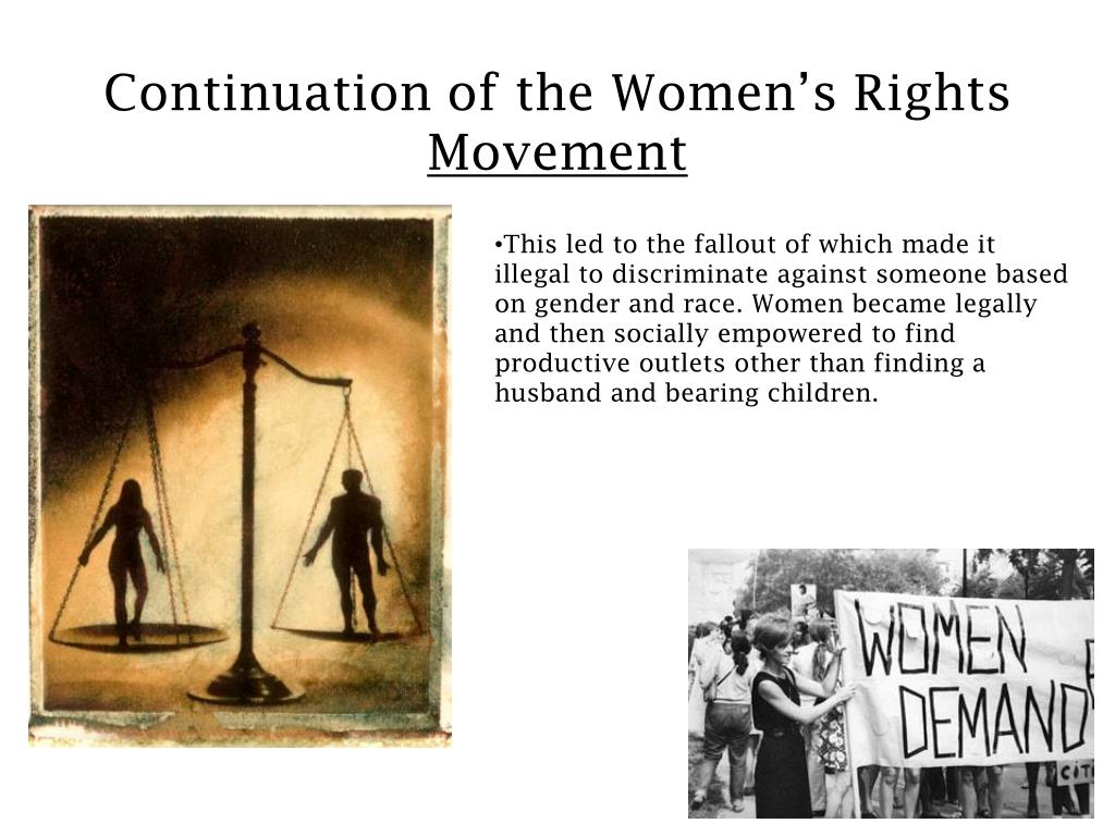 Continuation of the Women’s Rights Movement • This led to the fallout of which made it illegal to discriminate against someone based on gender and race. Women became legally and then socially empowered to find productive outlets other than finding a husband and bearing children.