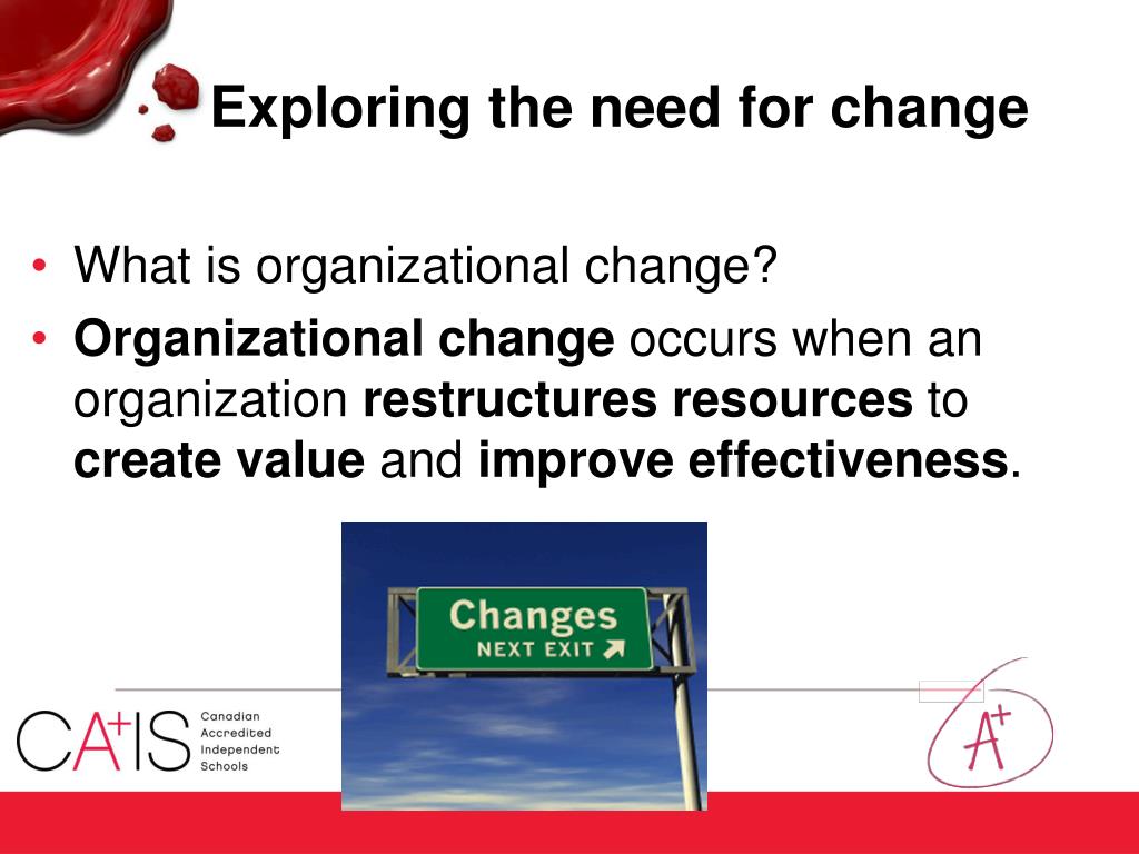 Exploring the need for change • What is organizational change? • Organizational change occurs when an organization restructures resources to create value and improve effectiveness.