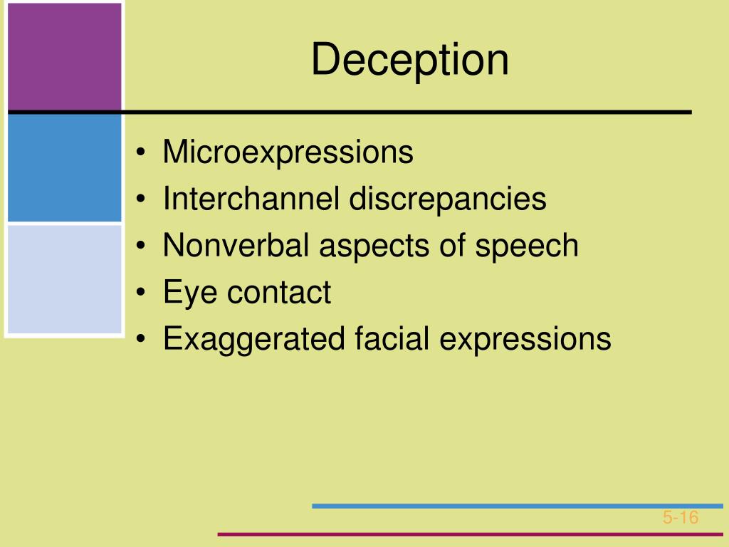 Deception • Microexpressions • Interchannel discrepancies • Nonverbal aspects of speech • Eye contact • Exaggerated facial expressions