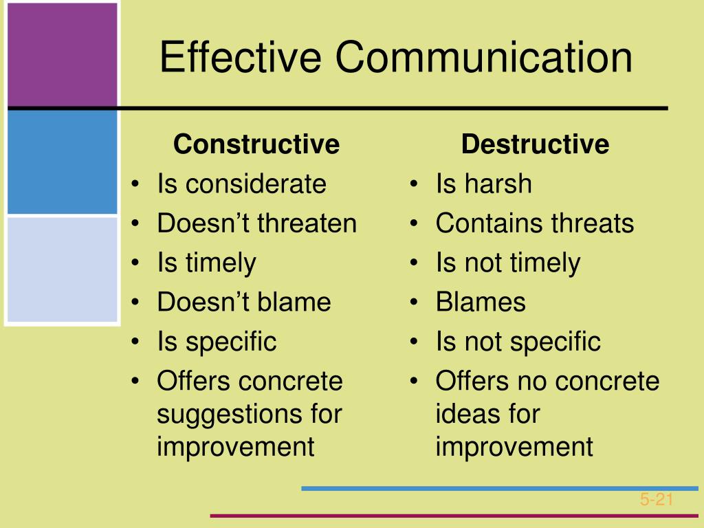 Constructive Is considerate Doesn’t threaten Is timely Doesn’t blame Is specific Offers concrete suggestions for improvement Destructive Is harsh Contains threats Is not timely Blames Is not specific Offers no concrete ideas for improvement Effective Communication