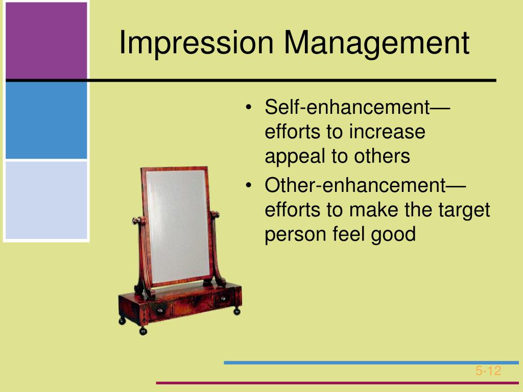 Impression Management • Self-enhancement—efforts to increase appeal to others • Other-enhancement—efforts to make the target person feel good