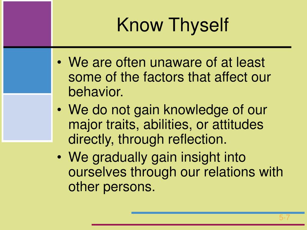 Know Thyself • We are often unaware of at least some of the factors that affect our behavior. • We do not gain knowledge of our major traits, abilities, or attitudes directly, through reflection. • We gradually gain insight into ourselves through our relations with other persons.