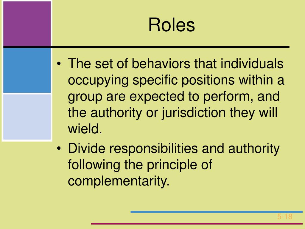 Roles • The set of behaviors that individuals occupying specific positions within a group are expected to perform, and the authority or jurisdiction they will wield. • Divide responsibilities and authority following the principle of complementarity.