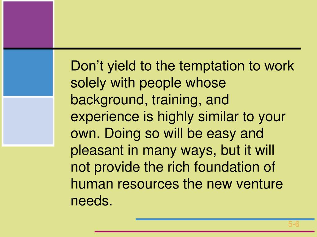 Don’t yield to the temptation to work solely with people whose background, training, and experience is highly similar to your own. Doing so will be easy and pleasant in many ways, but it will not provide the rich foundation of human resources the new venture needs.