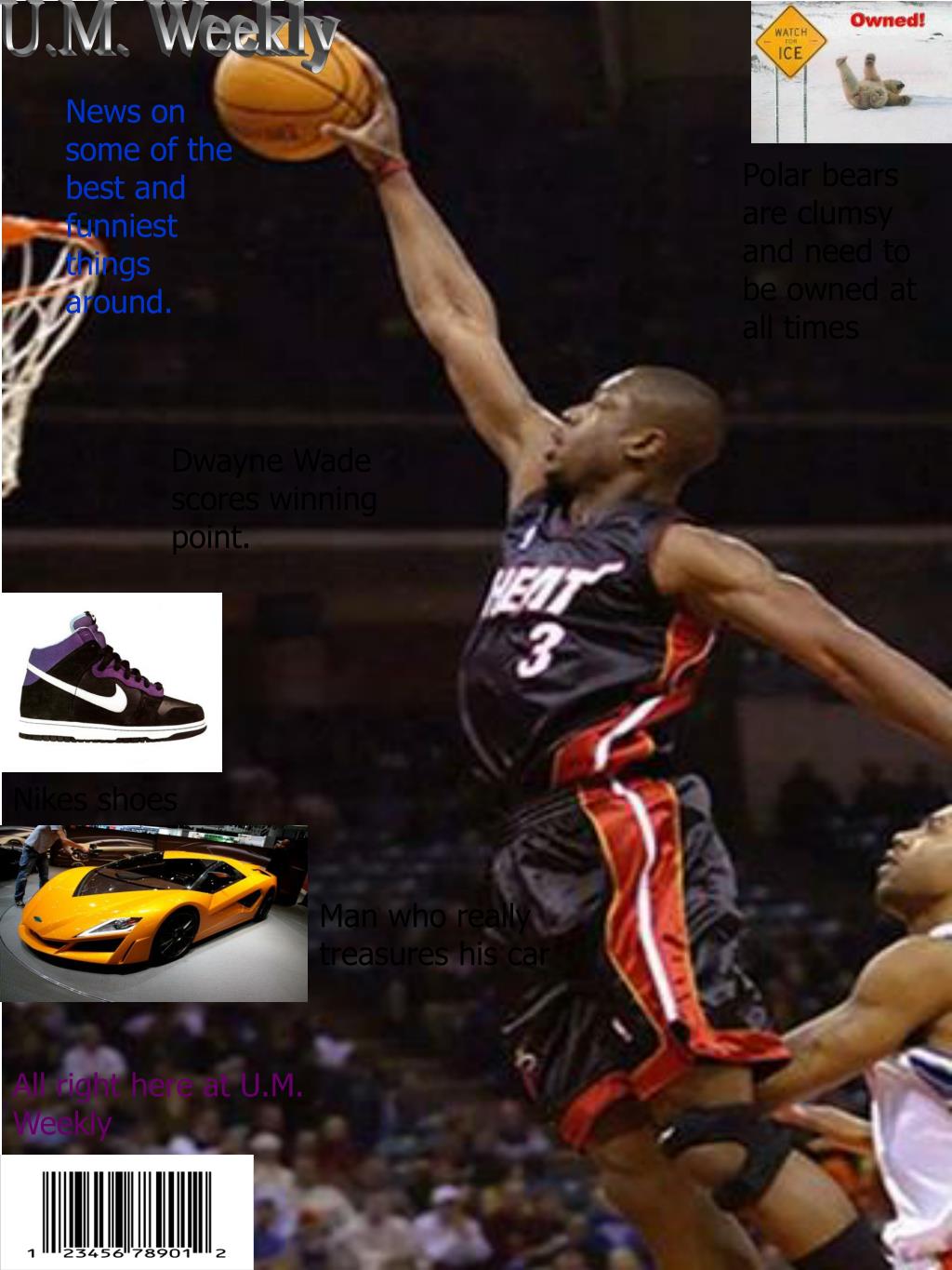 U.M. Weekly News on some of the best and funniest things around. Polar bears are clumsy and need to be owned at all times Dwayne Wade scores winning point. Nikes shoes Man who really treasures his car All right here at U.M. Weekly