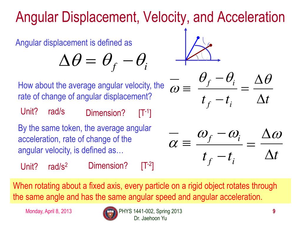 PHYS 1441 – Section 002Lecture #19 Monday, April 8, 2013 Dr. Jaehoon Yu • Fundamentals of the Rotational Motion • Rotational Kinematics • Equations of Rotational Kinematics • Relationship Between Angular and Linear Quantities • Rolling Motion of a Rigid Body Today’s homework is homework #10, due 11pm, Monday, Apr. 15!!