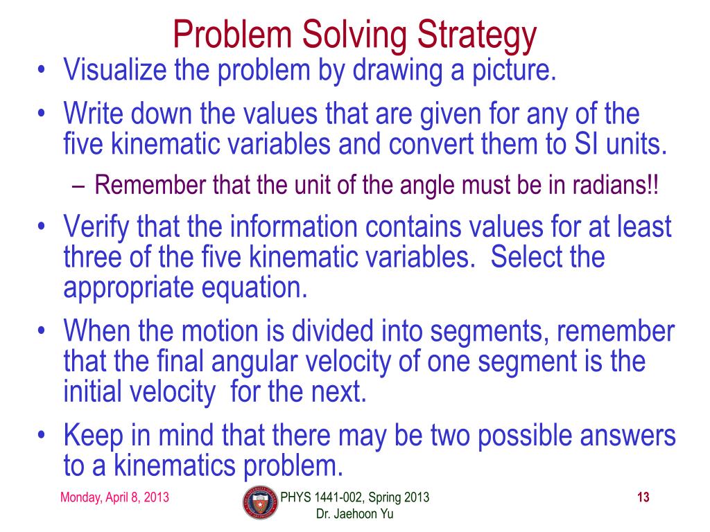 Problem Solving Strategy • Visualize the problem by drawing a picture. • Write down the values that are given for any of the fivekinematic variables and convert them to SI units. • Remember that the unit of the angle must be in radians!! • Verify that the information contains values for at least threeof the five kinematic variables. Select the appropriate equation. • When the motion is divided into segments, remember thatthe final angularvelocity of one segment is the initial velocity for the next. • Keep in mind that there may be two possible answers to a kinematics problem. PHYS 1441-002, Spring 2013 Dr. Jaehoon Yu