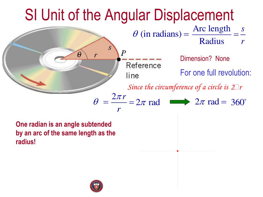 SI Unit of the Angular Displacement Dimension? None For one full revolution: Since the circumference of a circle is 2πr One radian is an angle subtended by an arc of the same length as the radius!