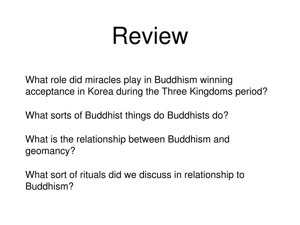 Traditional Korean medicine. Feb. 6, 2014. Review. What role did miracles play in Buddhism winning acceptance in Korea during the Three Kingdoms period? What sorts of Buddhist things do Buddhists do? What is the relationship between Buddhism and geomancy?