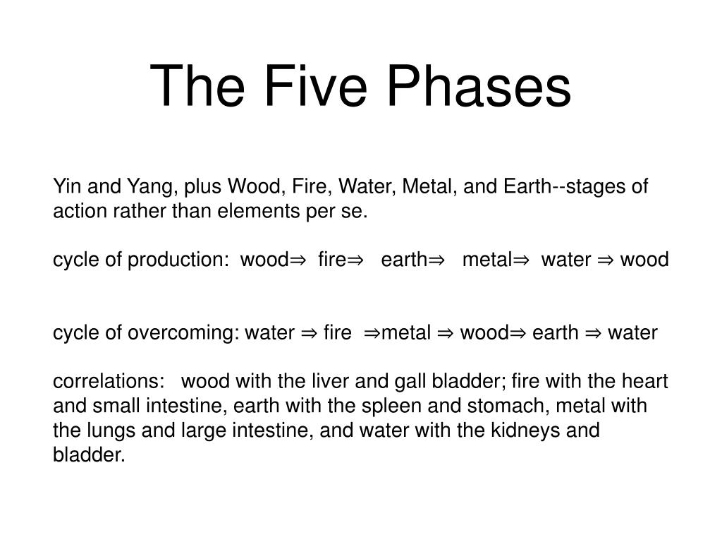 The Five Phases • Yin and Yang, plus Wood, Fire, Water, Metal, and Earth--stages of action rather than elements per se. • cycle of production: wood⇒ fire⇒ earth⇒ metal⇒ water ⇒ wood • cycle of overcoming: water ⇒ fire ⇒metal ⇒ wood⇒ earth ⇒ water • correlations: wood with the liver and gall bladder; fire with the heart and small intestine, earth with the spleen and stomach, metal with the lungs and large intestine, and water with the kidneys and bladder.