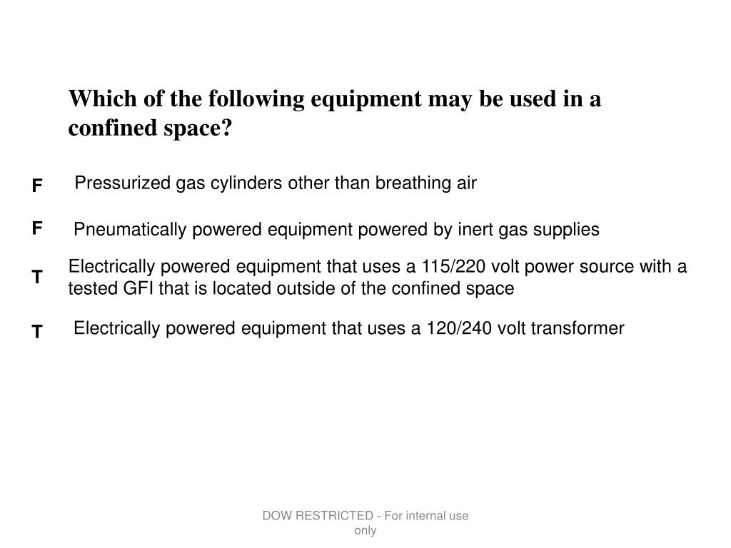 Which of the following equipment may be used in a confined space? Pressurized gas cylinders other than breathing air Pneumatically powered equipment powered by inert gas supplies Electrically powered equipment that uses a 115/220 volt power source with a tested GFI that is located outside of the confined space Electrically powered equipment that uses a 120/240 volt transformer F F T T DOW RESTRICTED - For internal use only