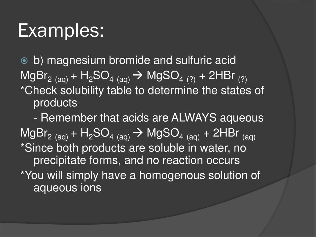 Examples: • b) magnesium bromide and sulfuric acid MgBr2(aq) + H2SO4(aq) MgSO4(?) + 2HBr (?) *Check solubility table to determine the states of products - Remember that acids are ALWAYS aqueous MgBr2(aq) + H2SO4(aq) MgSO4(aq) + 2HBr (aq) *Since both products are soluble in water, no precipitate forms, and no reaction occurs *You will simply have a homogenous solution of aqueous ions