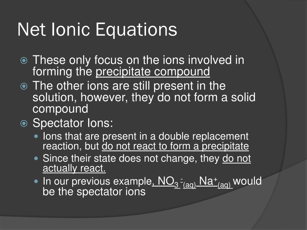 Net Ionic Equations • These only focus on the ions involved in forming the precipitate compound • The other ions are still present in the solution, however, they do not form a solid compound • Spectator Ions: • Ions that are present in a double replacement reaction, but do not react to form a precipitate • Since their state does not change, they do not actually react. • In our previous example, NO3 -(aq) Na+(aq) would be the spectator ions