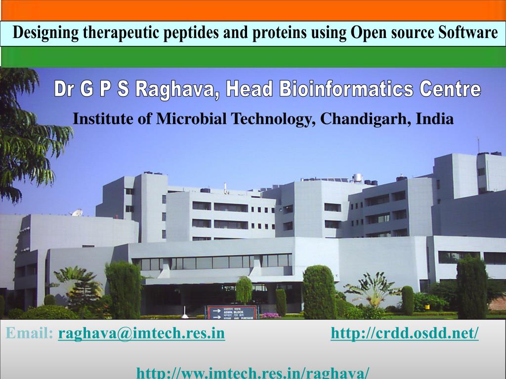 Designing therapeutic peptides and proteins using Open source Software. Dr G P S Raghava, Head Bioinformatics Centre. Institute of Microbial Technology, Chandigarh, India. Email: raghava@imtech.res.in http://crdd.osdd.net/ http://ww.imtech.res.in/raghava/.