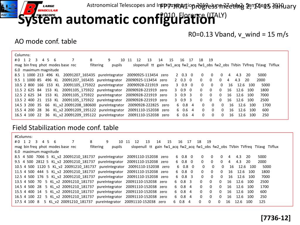 FP7-JRA1 progress meeting 2, 14-15 January 2010, Florence (ITALY) System automatic configuration R0=0.13 Vband, v_wind = 15 m/s AO mode conf. table Columns: # 0 1 2 3 4 5 6 7 8 9 10 11 12 13 14 15 16 17 18 19 mag bin freq phot modes base rec filtering pupils slopenulltt gain fw1_acq fw2_acq fw1_obs fw2_obs TVbinTVfreqTVavgTVflux 6.0 maximum magnitude 8.5 1 1000 213 496 KL 20091207_165435 pureIntegrator 20090925-113454 zero 2 0.3 0 0 0 0 4 4.3 20 5000 9.5 1 1000 85 496 KL 20091207_165435 pureIntegrator 20090925-113454 zero 2 0.3 0 0 0 0 4 4.3 20 2000 10.5 2 800 166 153 KL 20091105_175922 pureIntegrator 20090928-221919 zero 3 0.9 0 0 0 0 16 12.6 100 5000 11.5 2 625 84 153 KL 20091105_175922 pureIntegrator 20090928-221919 zero 3 0.9 0 0 0 0 16 12.6 100 1800 12.5 2 625 34 153 KL 20091105_175922 pureIntegrator 20090928-221919 zero 3 0.9 3 0 0 0 16 12.6 100 7000 13.5 2 400 21 153 KL 20091105_175922 pureIntegrator 20090928-221919 zero 3 0.9 3 0 0 0 16 12.6 100 2500 14.5 3 200 35 66 KL_v2 20091208_180600 pureIntegrator 20090928-222825 zero 6 0.8 4 0 0 0 16 12.6 100 1700 15.5 4 200 28 36 KL_v2 20091209_195122 pureIntegrator 20091110-152038 zero 6 0.6 4 0 0 0 16 12.6 100 600 16.5 4 100 22 36 KL_v2 20091209_195122 pureIntegrator 20091110-152038 zero 6 0.6 4 0 0 0 16 12.6 100 250 Field Stabilization mode conf. table #Columns: # 0 1 2 3 4 5 6 7 8 9 10 11 12 13 14 15 16 17 18 19 mag bin freq phot modes base rec filtering pupils slopenulltt gain fw1_acq fw2_acq fw1_obs fw2_obs TVbinTVfreqTVavgTVflux 6.0 maximum magnitude 8.5 4 500 7066 5 KL_v2 20091210_181737 pureIntegrator 20091110-152038 zero 6 0.8 0 0 0 0 4 4.3 20 5000 9.5 4 500 2812 5 KL_v2 20091210_181737 pureIntegrator 20091110-152038 zero 6 0.8 0 0 0 0 4 4.3 20 2000 10.5 4 500 1120 5 KL_v2 20091210_181737 pureIntegrator 20091110-152038 zero 6 0.8 0 0 0 0 16 12.6 100 5000 11.5 4 500 444 5 KL_v2 20091210_181737 pureIntegrator 20091110-152038 zero 6 0.8 0 0 0 0 16 12.6 100 1800 12.5 4 500 176 5 KL_v2 20091210_181737 pureIntegrator 20091110-152038 zero 6 0.8 3 0 0 0 16 12.6 100 7000 13.5 4 500 70 5 KL_v2 20091210_181737 pureIntegrator 20091110-152038 zero 6 0.8 3 0 0 0 16 12.6 100 2500 14.5 4 500 28 5 KL_v2 20091210_181737 pureIntegrator 20091110-152038 zero 6 0.8 4 0 0 0 16 12.6 100 1700 15.5 4 400 14 5 KL_v2 20091210_181737 pureIntegrator 20091110-152038 zero 6 0.8 4 0 0 0 16 12.6 100 600 16.5 4 100 22 5 KL_v2 20091210_181737 pureIntegrator 20091110-152038 zero 6 0.8 4 0 0 0 16 12.6 100 250 17.5 4 100 8 5 KL_v2 20091210_181737 pureIntegrator 20091110-152038 zero 6 0.8 4 0 0 0 16 12.6 100 125