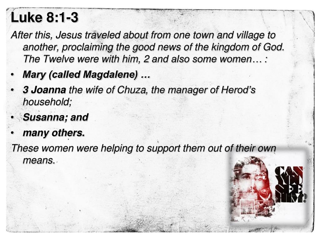 Luke 8:1-3 After this, Jesus traveled about from one town and village to another, proclaiming the good news of the kingdom of God. The Twelve were with him, 2 and also some women… : • Mary (called Magdalene) … • 3 Joanna the wife of Chuza, the manager of Herod’s household; • Susanna; and • many others. These women were helping to support them out of their own means.