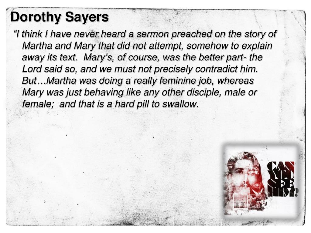 Dorothy Sayers “I think I have never heard a sermon preached on the story of Martha and Mary that did not attempt, somehow to explain away its text. Mary’s, of course, was the better part- the Lord said so, and we must not precisely contradict him. But…Martha was doing a really feminine job, whereas Mary was just behaving like any other disciple, male or female; and that is a hard pill to swallow.