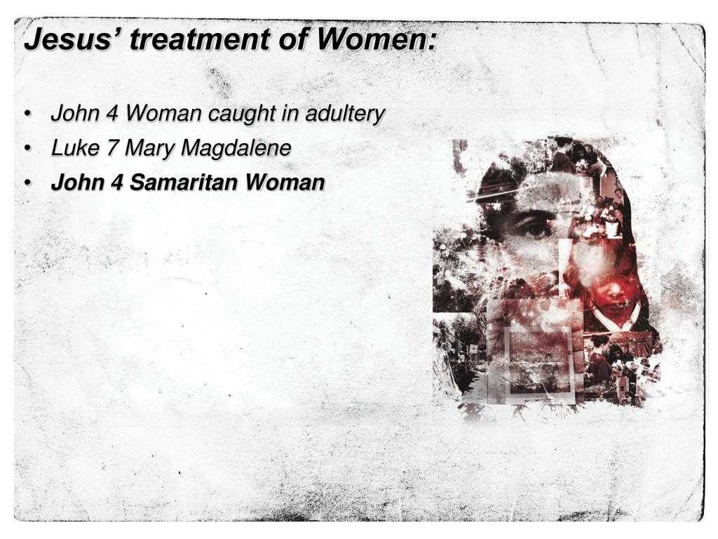 Jesus’ treatment of Women: • John 4 Woman caught in adultery • Luke 7 Mary Magdalene • John 4 Samaritan Woman