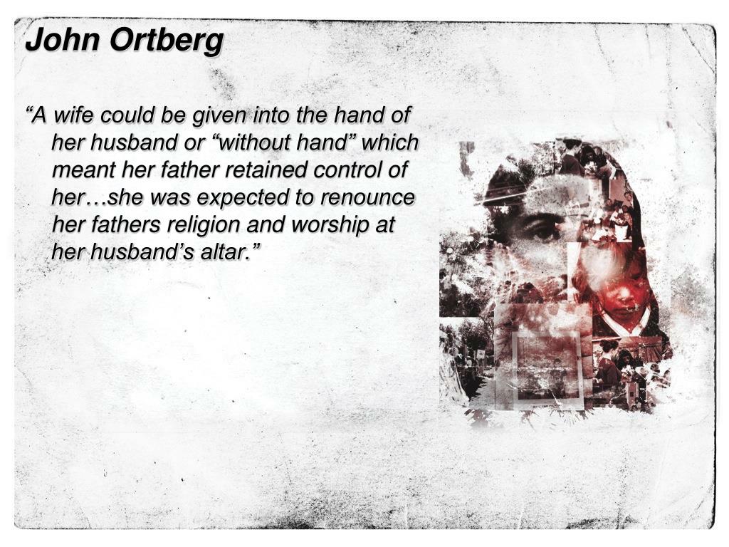 John Ortberg “A wife could be given into the hand of her husband or “without hand” which meant her father retained control of her…she was expected to renounce her fathers religion and worship at her husband’s altar.”
