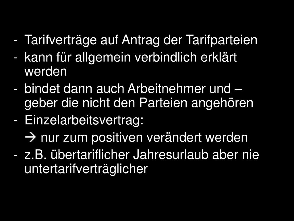 Tarifverträge auf Antrag der Tarifparteien • kann für allgemein verbindlich erklärt werden • bindet dann auch Arbeitnehmer und –geber die nicht den Parteien angehören • Einzelarbeitsvertrag: nur zum positiven verändert werden • z.B. übertariflicher Jahresurlaub aber nie untertarifverträglicher