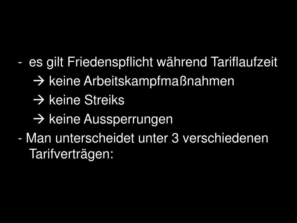 es gilt Friedenspflicht während Tariflaufzeit keine Arbeitskampfmaßnahmen keine Streiks keine Aussperrungen - Man unterscheidet unter 3 verschiedenen Tarifverträgen: