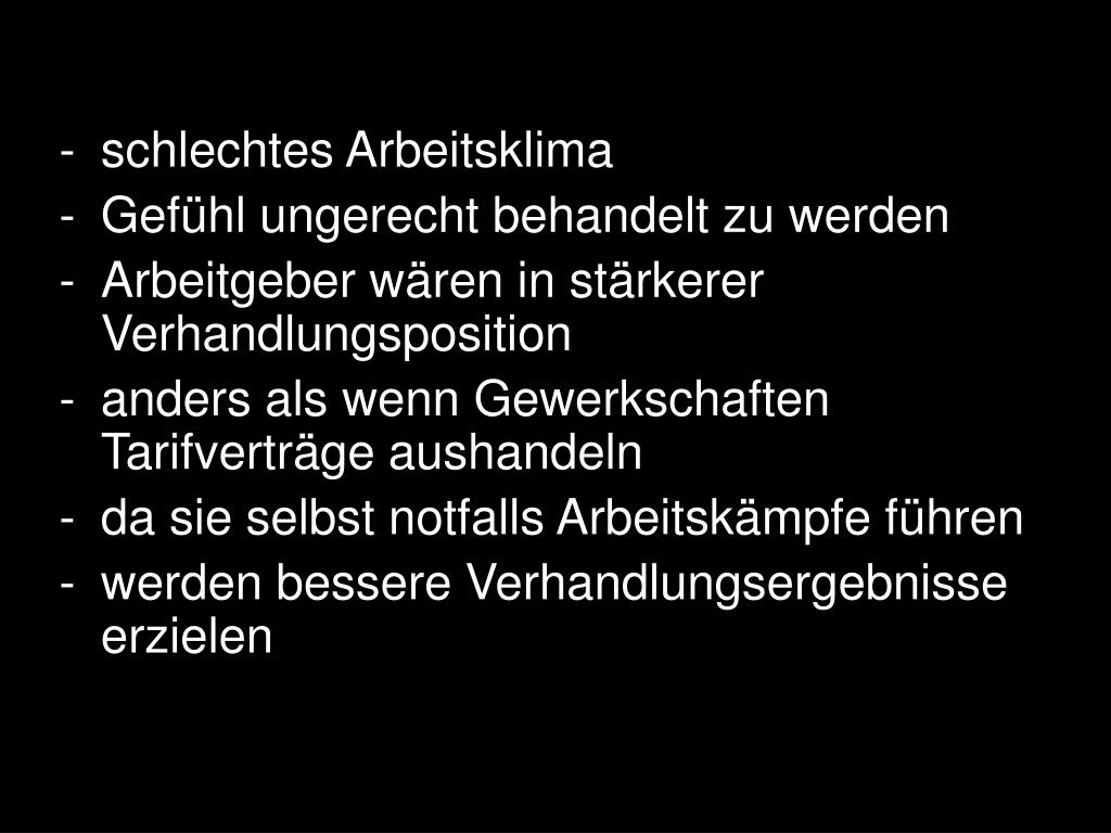 schlechtes Arbeitsklima • Gefühl ungerecht behandelt zu werden • Arbeitgeber wären in stärkerer Verhandlungsposition • anders als wenn Gewerkschaften Tarifverträge aushandeln • da sie selbst notfalls Arbeitskämpfe führen • werden bessere Verhandlungsergebnisse erzielen