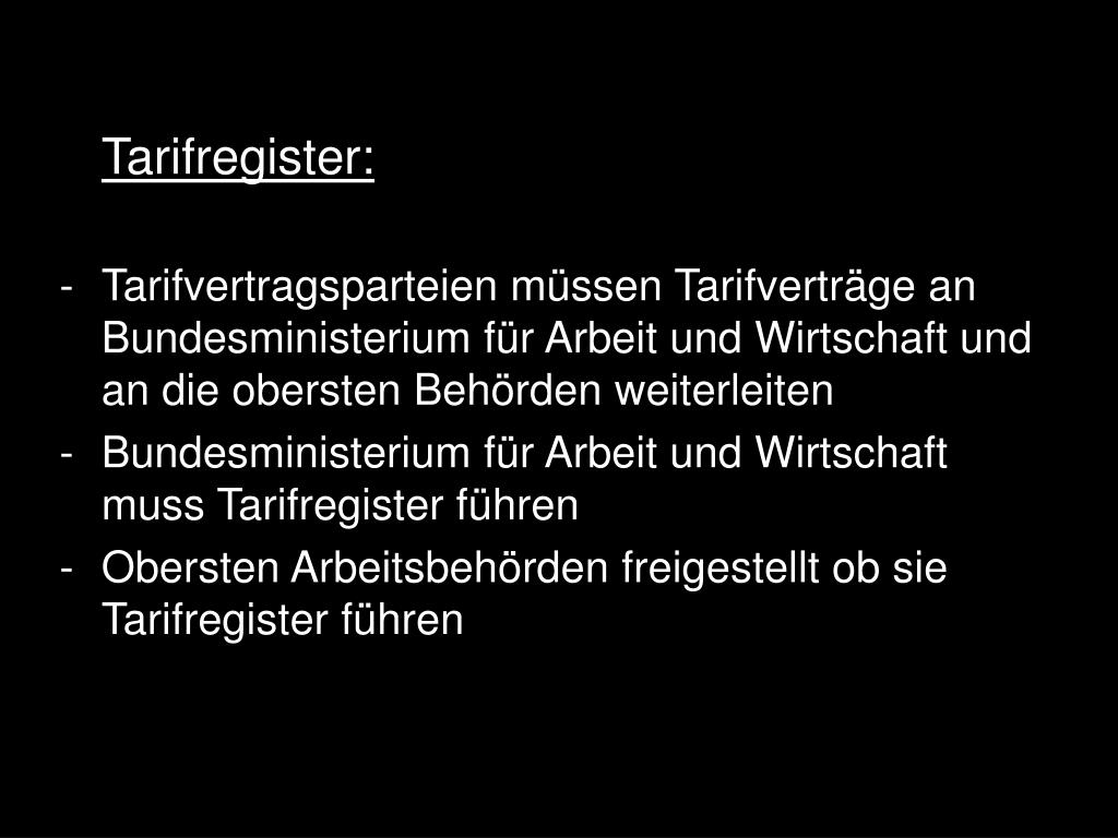 Tarifregister: • Tarifvertragsparteien müssen Tarifverträge an Bundesministerium für Arbeit und Wirtschaft und an die obersten Behörden weiterleiten • Bundesministerium für Arbeit und Wirtschaft muss Tarifregister führen • Obersten Arbeitsbehörden freigestellt ob sie Tarifregister führen