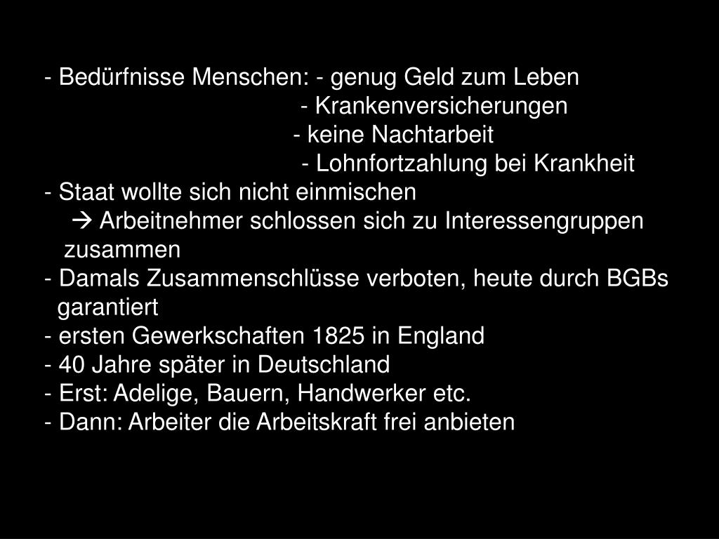 - Bedürfnisse Menschen: - genug Geld zum Leben • - Krankenversicherungen • - keine Nachtarbeit • - Lohnfortzahlung bei Krankheit • - Staat wollte sich nicht einmischen • Arbeitnehmer schlossen sich zu Interessengruppen • zusammen • Damals Zusammenschlüsse verboten, heute durch BGBs • garantiert • - ersten Gewerkschaften 1825 in England • - 40 Jahre später in Deutschland • - Erst: Adelige, Bauern, Handwerker etc. • - Dann: Arbeiter die Arbeitskraft frei anbieten