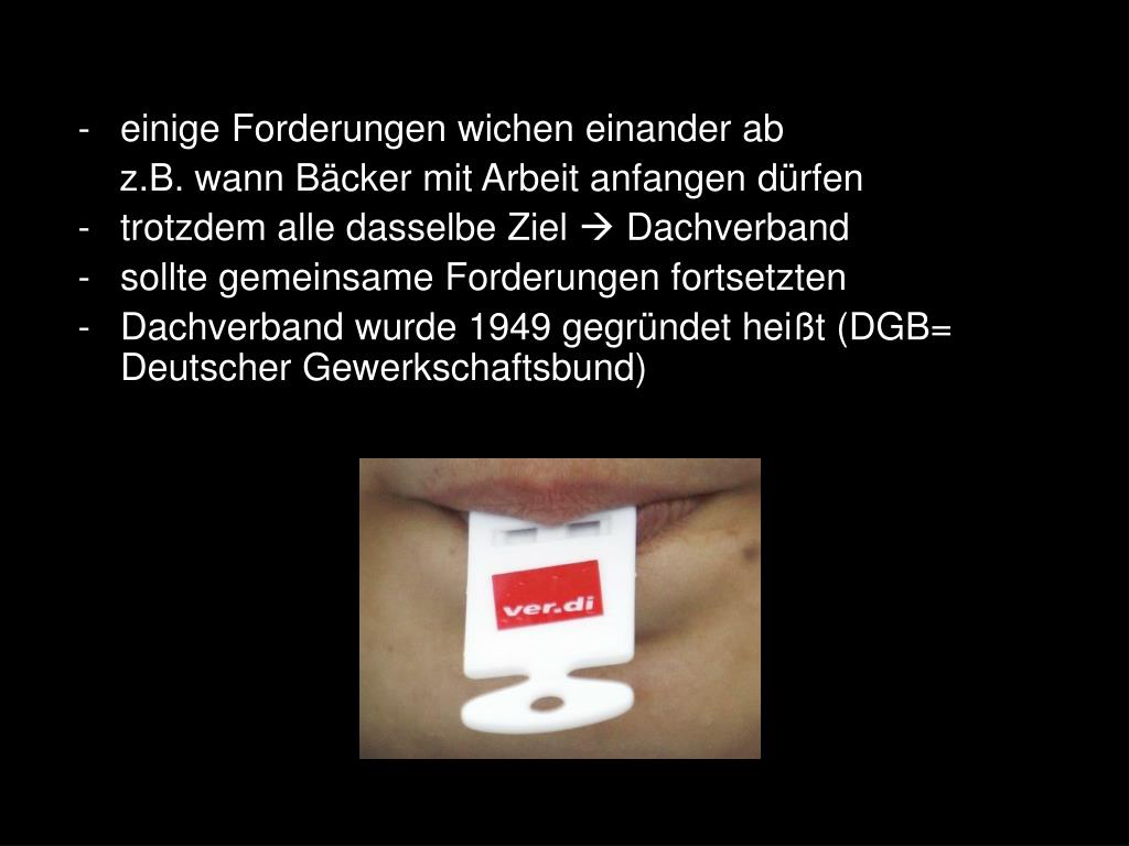 einige Forderungen wichen einander ab z.B. wann Bäcker mit Arbeit anfangen dürfen • trotzdem alle dasselbe Ziel Dachverband • sollte gemeinsame Forderungen fortsetzten • Dachverband wurde 1949 gegründet heißt (DGB= Deutscher Gewerkschaftsbund)