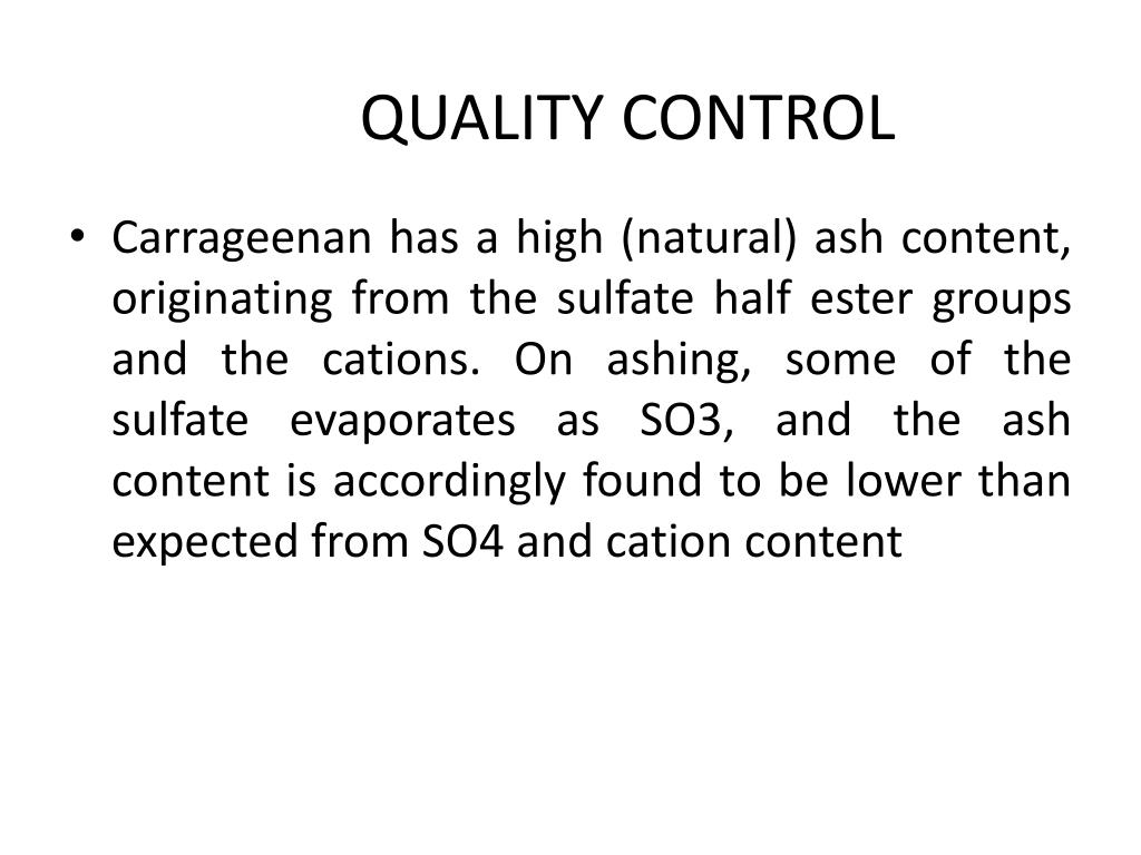QUALITY CONTROL • Carrageenan has a high (natural) ash content, originating from the sulfate half ester groups and the cations. On ashing, some of the sulfate evaporates as SO3, and the ash content is accordingly found to be lower than expected from SO4 and cation content
