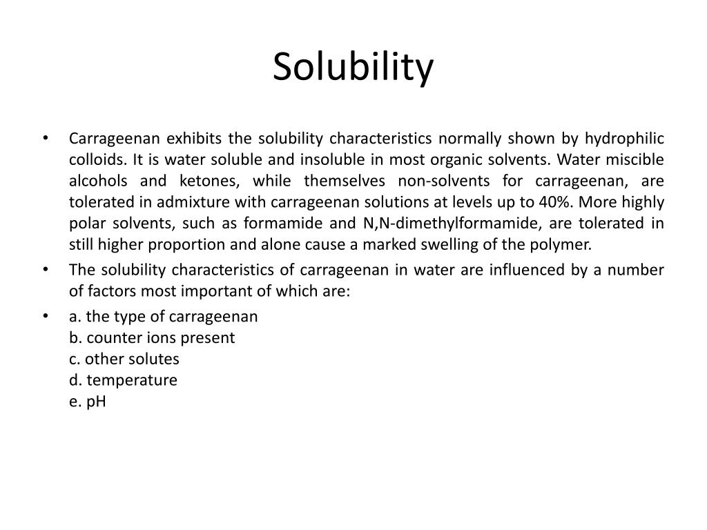 Solubility • Carrageenan exhibits the solubility characteristics normally shown by hydrophilic colloids. It is water soluble and insoluble in most organic solvents. Water miscible alcohols and ketones, while themselves non-solvents for carrageenan, are tolerated in admixture with carrageenan solutions at levels up to 40%. More highly polar solvents, such as formamide and N,N-dimethylformamide, are tolerated in still higher proportion and alone cause a marked swelling of the polymer. • The solubility characteristics of carrageenan in water are influenced by a number of factors most important of which are: • a. the type of carrageenanb. counter ions presentc. other solutesd. temperaturee. pH