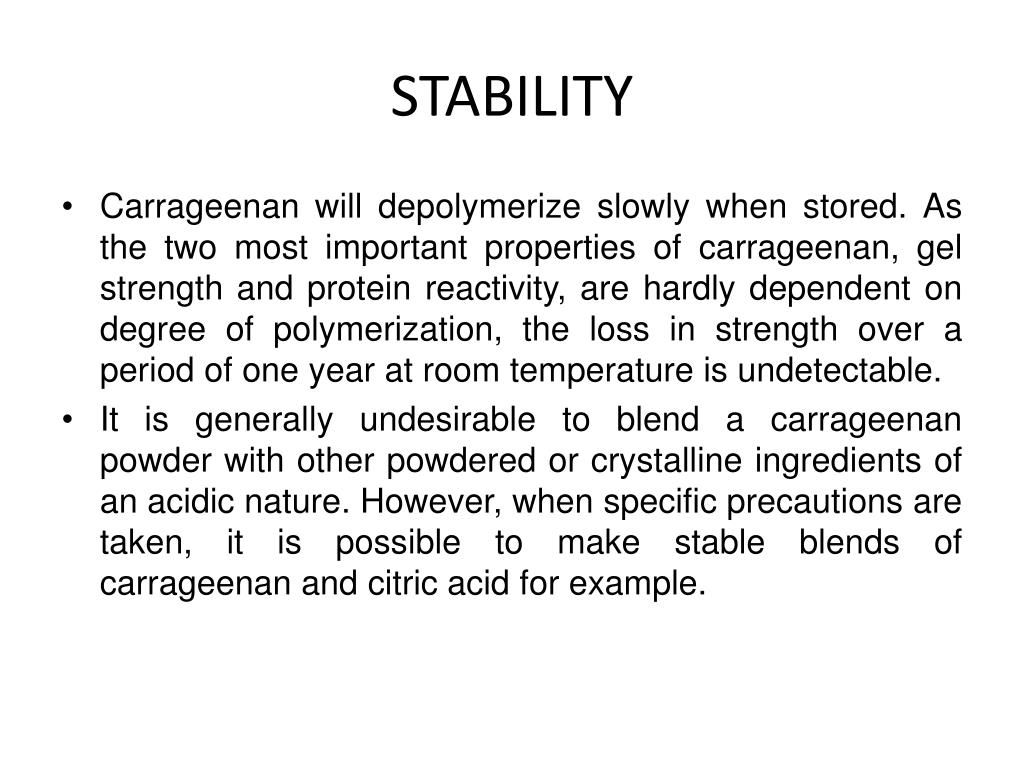 STABILITY • Carrageenan will depolymerize slowly when stored. As the two most important properties of carrageenan, gel strength and protein reactivity, are hardly dependent on degree of polymerization, the loss in strength over a period of one year at room temperature is undetectable. • It is generally undesirable to blend a carrageenan powder with other powdered or crystalline ingredients of an acidic nature. However, when specific precautions are taken, it is possible to make stable blends of carrageenan and citric acid for example.