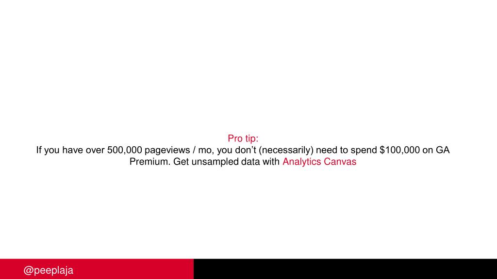 @peeplaja Pro tip: If you have over 500,000 pageviews / mo, you don’t (necessarily) need to spend $100,000 on GA Premium. Get unsampled data with Analytics Canvas