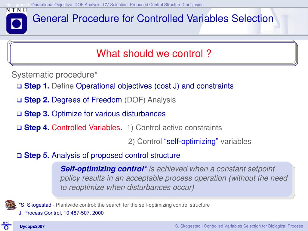 Background Operational Objective DOF Analysis CV Selection Proposed Control Structure Conclusion Conclusion Biological wastewater treatment plant: Potential for large improvements in operation Use systematic procedure • Step 1. Define Operational Objectives (J) and constraints • Step 2. Degree of FreedomAnalysis • Step 3. Optimize for various disturbances • Step 4. Controlled Variable selection: Use Maximum gain rule for screening • Waste sludge flow controls mixed liquor suspended solids, MLSS • Recycle ratio Qr/Qin is constant • Air: DO setpoints at their optimal values
