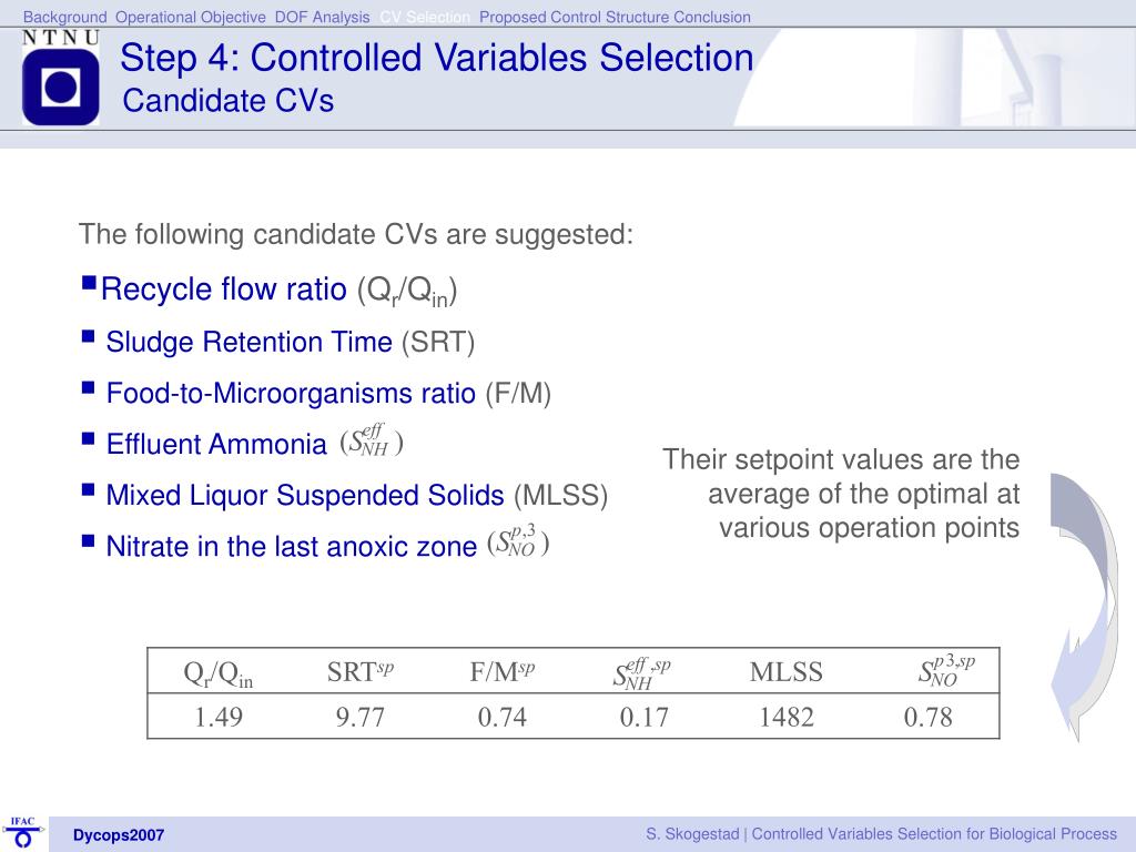 Background Operational Objective DOF AnalysisCV Selection Proposed Control Structure Conclusion Step 2: Degrees of Freedom Analysis • DOFs for control (valves, MVs) Nm = 7 • – given feed (influent) -1 • Need to control two levels with no steady-state effect -2 • = Steady-state DOFs Nopt = 4 • Common: Control dissolved oxygen (DO) in both anoxic and aerated zones - 2 • Remaining DOFs (need to identify CVs) = 2
