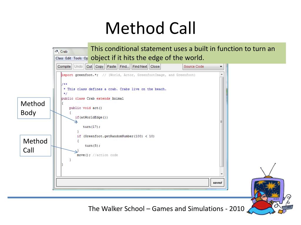 Method Call This conditional statement uses a built in function to turn an object if it hits the edge of the world. Method Body Method Call The Walker School – Games and Simulations - 2010