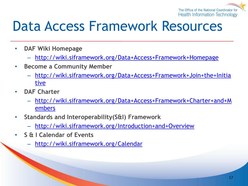 Data Access Framework Resources • DAF Wiki Homepage • http://wiki.siframework.org/Data+Access+Framework+Homepage • Become a Community Member • http://wiki.siframework.org/Data+Access+Framework+Join+the+Initiative • DAF Charter • http://wiki.siframework.org/Data+Access+Framework+Charter+and+Members • Standards and Interoperability(S&I) Framework • http://wiki.siframework.org/Introduction+and+Overview • S & I Calendar of Events • http://wiki.siframework.org/Calendar