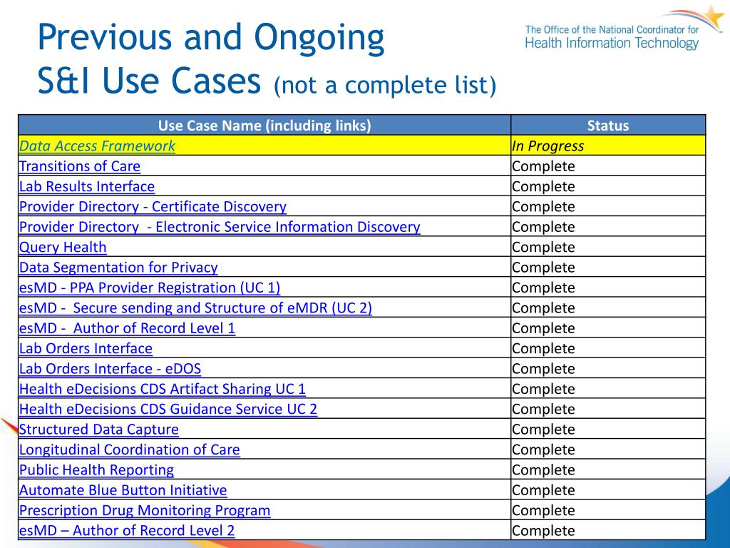 Initiative Support Leads • For questions, please feel free to contact your support leads: • Initiative Coordinator: John Feikema john.feikema@siframework.org • ONC Sponsors: Mera Choi mera.choi@hhs.gov • Support Team: • Project Management: • GayathriJayawardenagayathri.jayawardena@esacinc.com • Technical Support: • Dragon (Nagesh) Bashyam nagesh.bashyam@drajer.com • Use Case Development: • Presha Patel presha.patel@accenture.com • Hema Patel hema.patel@accenture.com • Standards Support: • Angelique Cortez angelique.j.cortez@accenture.com • Vocabulary and Terminology Subject Matter Expert: • Mark Roche mrochemd@gmail.com