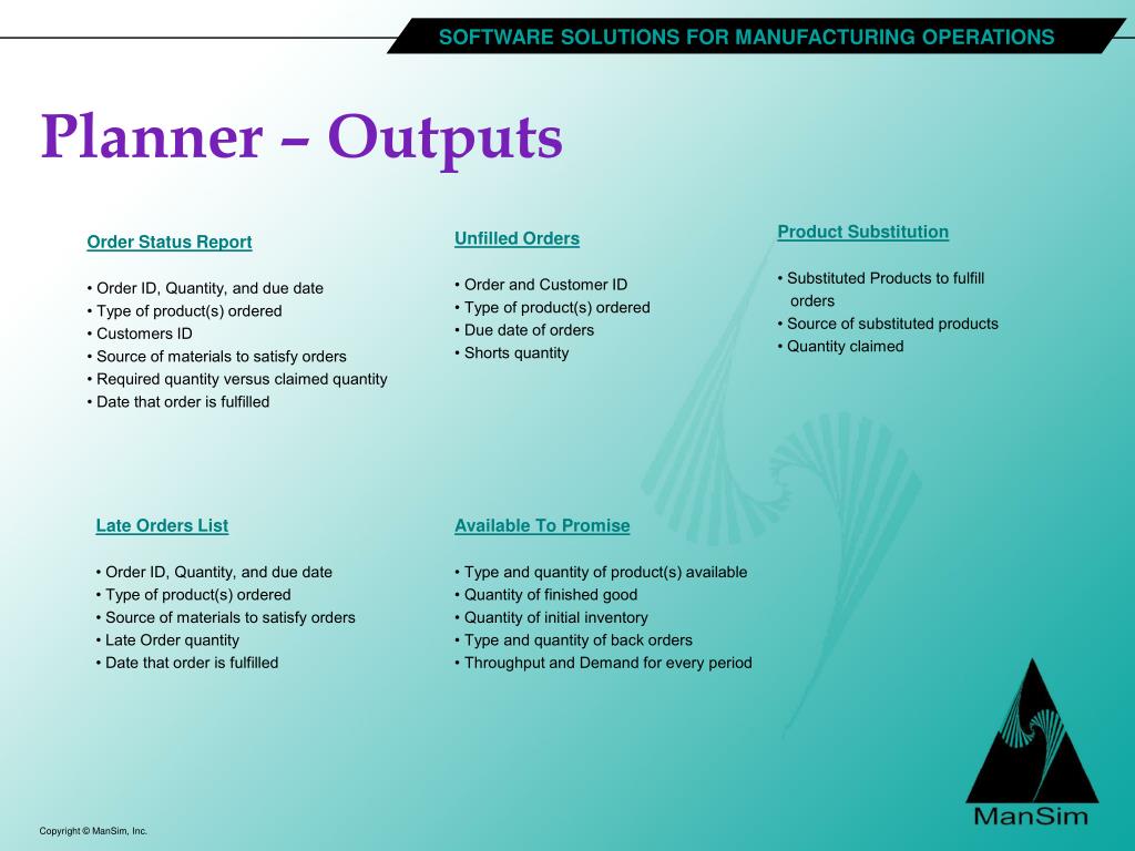 Planner – Outputs Product Substitution • Substituted Products to fulfill orders • Source of substituted products • Quantity claimed Unfilled Orders • Order and Customer ID • Type of product(s) ordered • Due date of orders • Shorts quantity Order Status Report • Order ID, Quantity, and due date • Type of product(s) ordered • Customers ID • Source of materials to satisfy orders • Required quantity versus claimed quantity • Date that order is fulfilled Late Orders List • Order ID, Quantity, and due date • Type of product(s) ordered • Source of materials to satisfy orders • Late Order quantity • Date that order is fulfilled Available To Promise • Type and quantity of product(s) available • Quantity of finished good • Quantity of initial inventory • Type and quantity of back orders • Throughput and Demand for every period