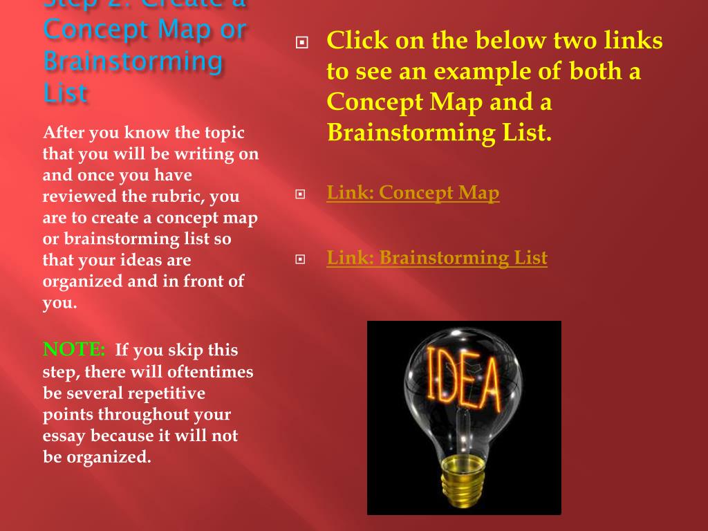 Step 2: Create a Concept Map or Brainstorming List • Click on the below two links to see an example of both a Concept Map and a Brainstorming List. • Link: Concept Map • Link: Brainstorming List After you know the topic that you will be writing on and once you have reviewed the rubric, you are to create a concept map or brainstorming list so that your ideas are organized and in front of you. NOTE: If you skip this step, there will oftentimes be several repetitive points throughout your essay because it will not be organized.