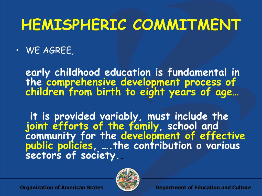 HEMISPHERIC COMMITMENT • WE AGREE, early childhood education is fundamental in thecomprehensive development process of children from birth to eight years of age… it is provided variably, must include the joint efforts of the family, school and community for the development of effective public policies, ….the contribution o various sectors of society..